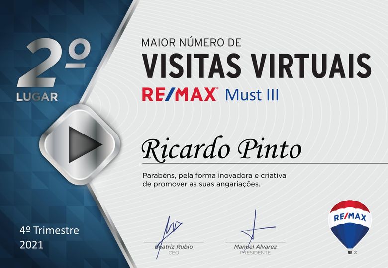 É sempre bom ser reconhecido pelo departamento de qualidade da RE/MAX Portugal pela forma como faço o meu trabalho, obrigado!