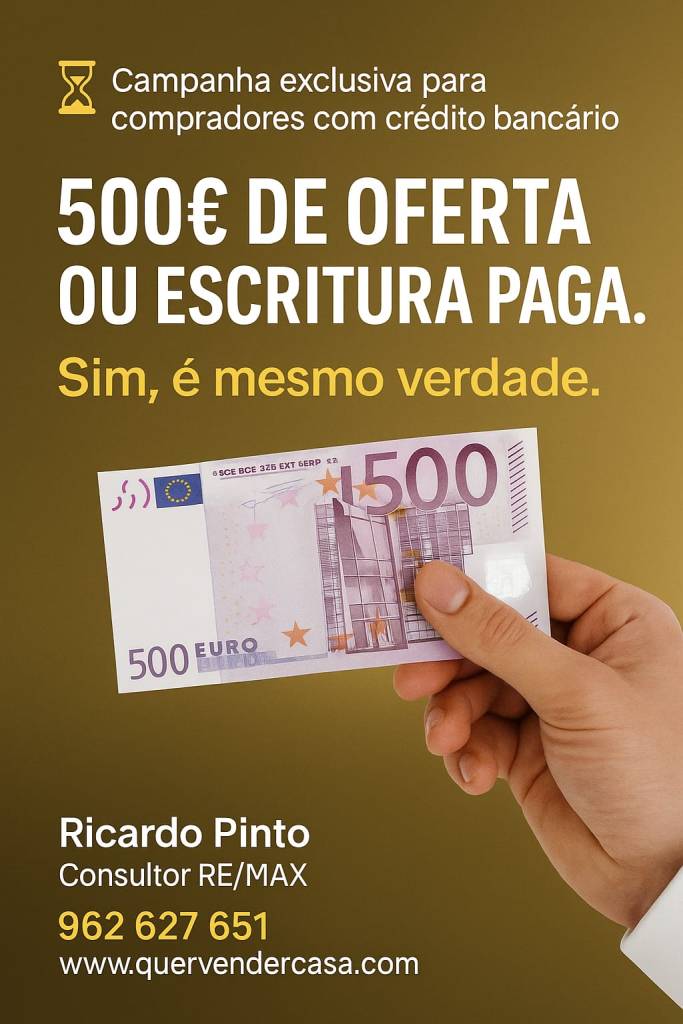 Se comprar casa comigo, eu ofereço-lhe 500€ ou pago a escritura — sem custos extra, sem complicações.